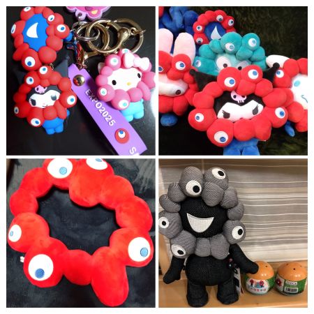 ミャクミャクのぬいぐるみやストラップ、バッジなどを付けている方が